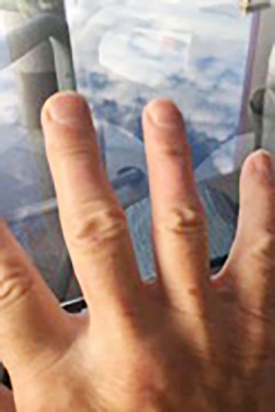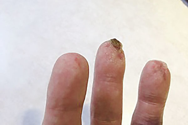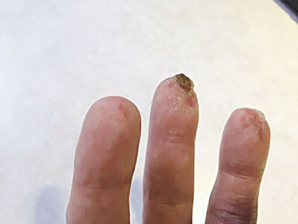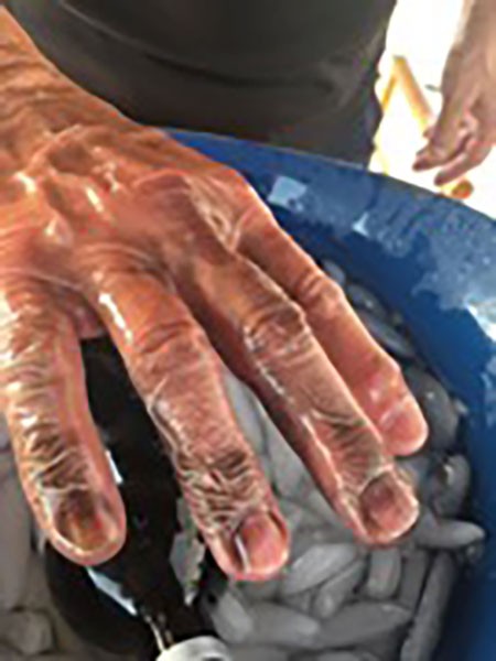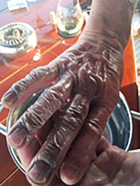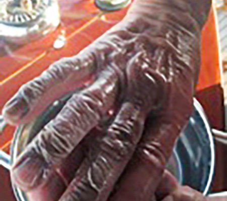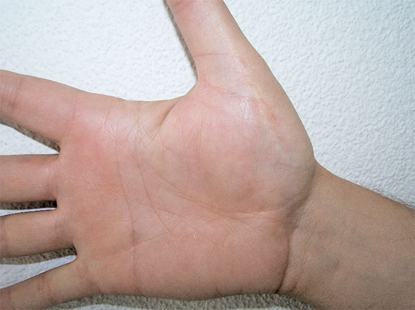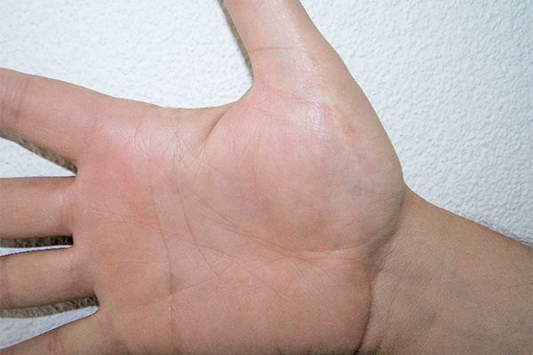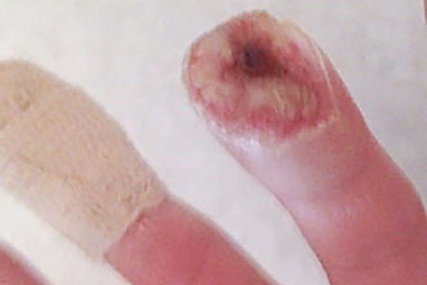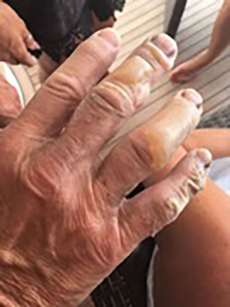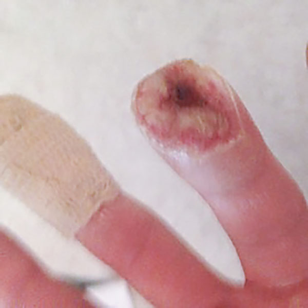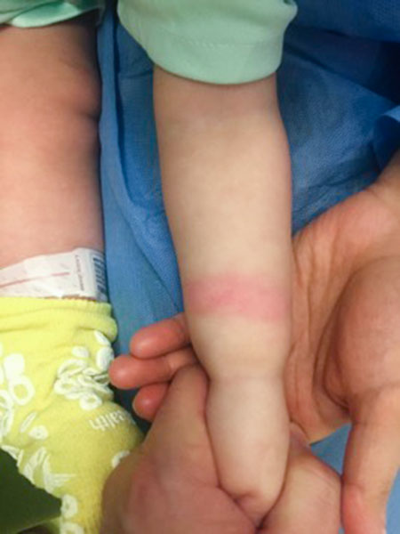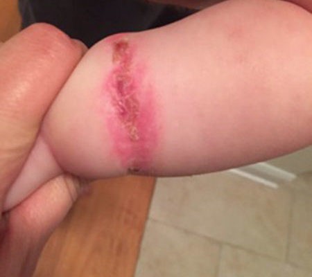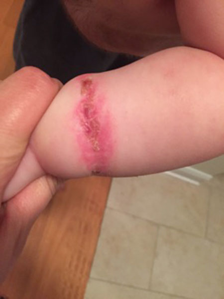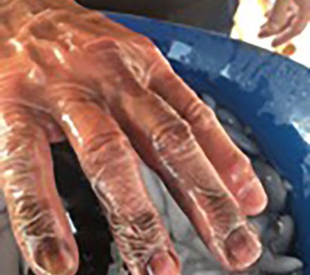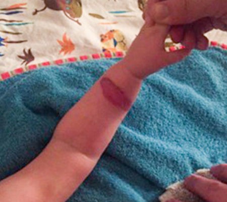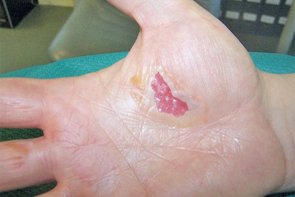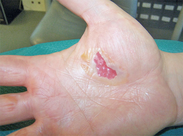 2nd – 3rd degree burn on the right palm of the hand with a hot iron; treatment with ActiMaris® Wound Irrigation Solution forte and Wound Gel
